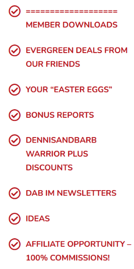 Deals From Our Friends. Over the years, Barb and I have become friends with lots of influential and brilliant marketers. So, I’ve asked many of them to help us out by allowing you to access some of their best products FOR FREE. These are deals not available to the public, and I’m not going to tell all the details here, but when you become a DAB Insider, you’ll understand what I’m talking about. I call it “the best of the best from the best” because some of the deals have been awarded Deal of the Day status on sites like Warrior Plus. These deals are evergreen, selected due to premium quality, and remain on the site as long as our friend allows it.