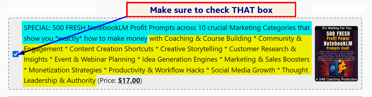 That in-line order bump? Like I mentioned earlier, it provides you with OVER 500 power prompts for 10 incredibly important Marketing Categories like making money with affiliate marketing, blogging, eCom and so so SO much more!
