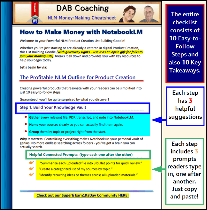 You’ll hand them this easy-to-read NotebookLM goodie that provides them with a clear, simple 10 step path to turn their scattered files and ideas into content, products, and *profitable assets.*